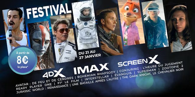 * 8€ la place ScreenX, 10€ la place 4DX, 10€ la place IMAX, 2€ le supplément 3D pour les films programmés dans le cadre du Festival. Technologies et programmation variables en fonction de votre complexe.