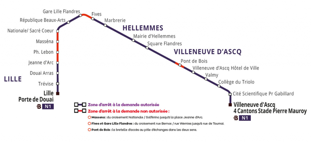 La ligne de nuit relie les arrêts Lille Porte de Douai à Villeneuve d’Ascq 4 Cantons Stade Pierre-Mauroy, en passant par Hellemmes, la gare Lille-Flandres et le centre-ville de Lille (Masséna, République Beaux-Arts) au cœur de la vie nocturne lilloise.