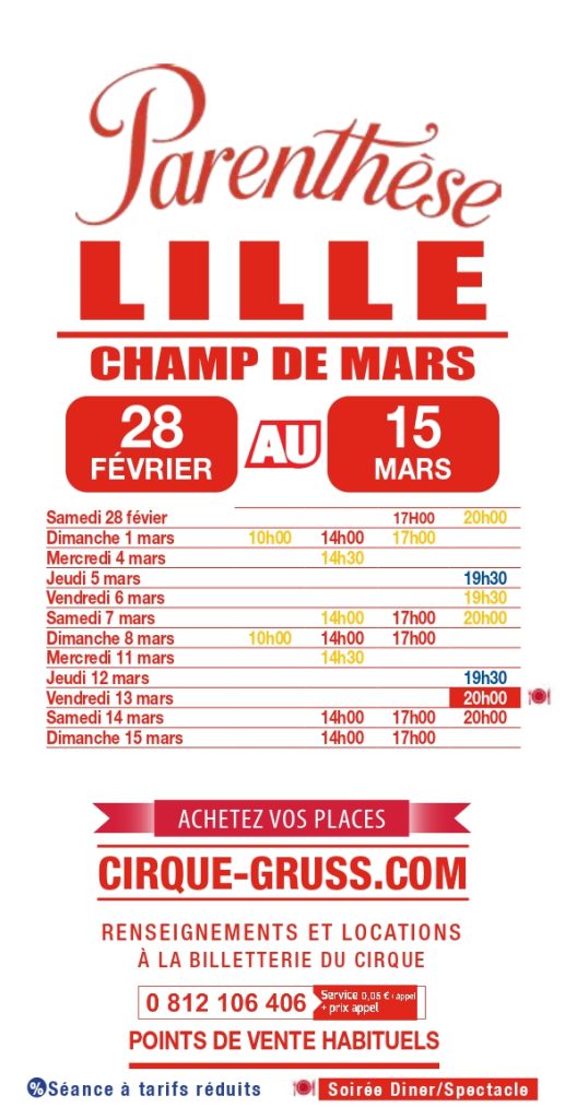 Du 28 février au 15 mars 2026, le Cirque Arlette Gruss posera ses valises sur le Champ de Mars de Lille. Durant 15 jours, découvrez le nouveau spectacle du Cirque Arlette Gruss intitulé « Parenthèse ». A noter qu‘un dîner-spectacle est également proposé pendant leur séjour lillois.