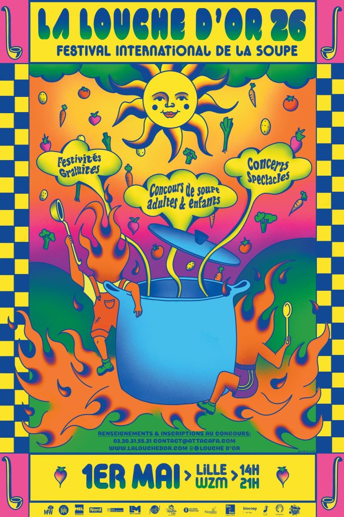 Vendredi 01 mai 2026, nouvelle édition de la Louche d’Or à Lille-Wazemmes. Chaque année, le 1er mai, le quartier de Wazemmes accueille un festival de rue pluridisciplinaire (concerts, spectacles, ateliers…) pour lequel les habitants du quartier peuvent concocter des soupes originales qu’ils offrent à tous. La Louche d’Or permet ainsi de découvrir les saveurs des soupes du monde. La dégustation se fait de stand en stand, un bol à la main. Ce rendez-vous rassemble des chefs émérites, des cordons bleus anonymes et des cuisiniers inventifs. L’un d’eux se voit décerner la Louche d’Or qui récompense la qualité et l’originalité de sa recette. A travers les rues de Wazemmes, ce sont chaque année plusieurs dizaines de milliers de gastronomes qui se retrouvent pour cet événement festif. Cet étonnant festival a été créer par l’association lilloise Attacafa qui, depuis 1984, travaille notamment à diffuser les musiques du monde.