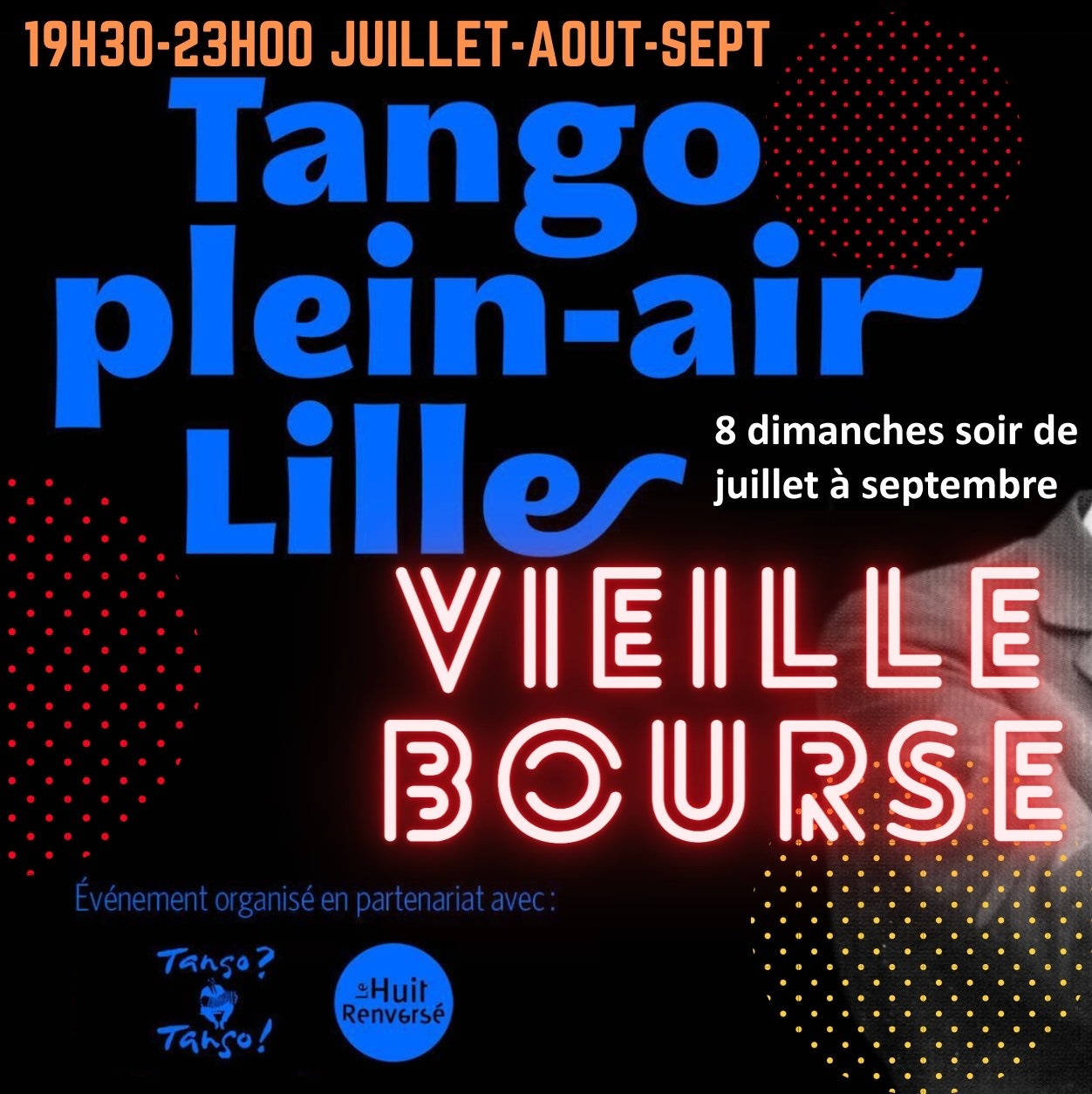 A partir du 07 juillet 2024, les associations Tango ? Tango ! et Le 8 Renversé investissent la Vieille Bourse de Lille pour vous proposer des soirées tango certains dimanches soir de l’été de 19h30 à 23h (du 07 juillet au 22 septembre 2024). A noter : pas de soirée, les dimanches 28 juillet 2024 (Jeux Olympiques), 04 août 2024 (Jeux Olympiques), 11 août 2024 (Jeux Olympiques) & 15 septembre 2024 (Braderie de Lille).