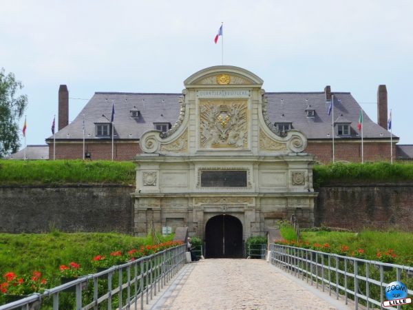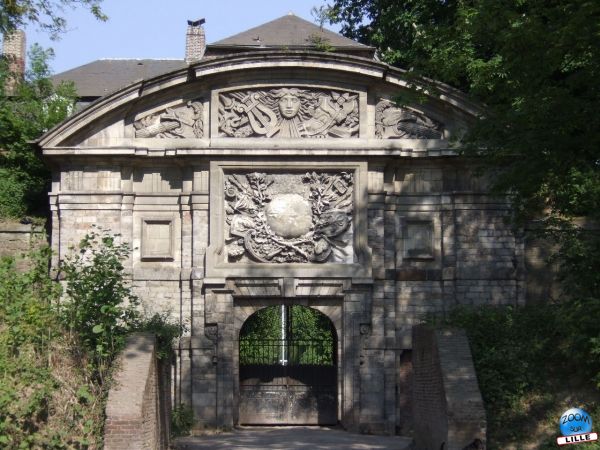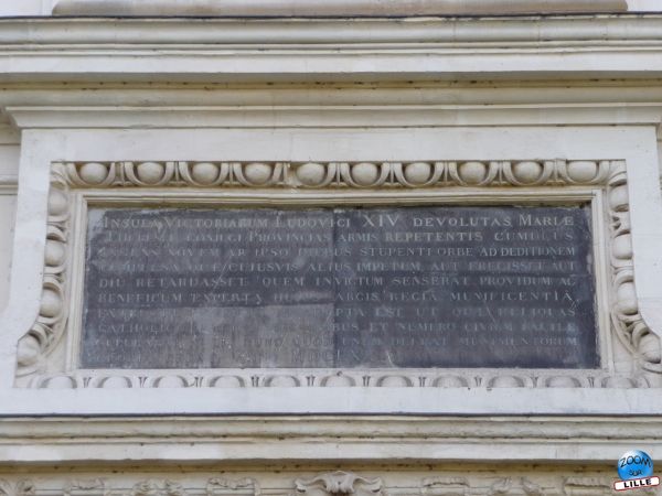 L’inscription marquée sur la Porte : « Lille, couronnement grandiose des victoires de Louis XIV, conquérant les provinces héritées par Marie-Thérèse, son épouse, et contrainte par lui-même, en neuf jours, à capituler, à l’étonnement de l’Univers, elle qui eût arrêté ou retardé longtemps l’élan de tout autre, a pu apprécier la sagesse et la bonté de Celui qu’elle avait reconnu invincible. Grâce à la protection de cette Citadelle érigée par la magnificence du Roi, déjà supérieure par ses richesses et le nombre de ses habitants aux autres cités de la Belgique catholique, elle ne le cède maintenant en rien à aucune d’elles pour la gloire de ses fortifications, seule chose qui lui manquait auparavant. Année 1670 ».